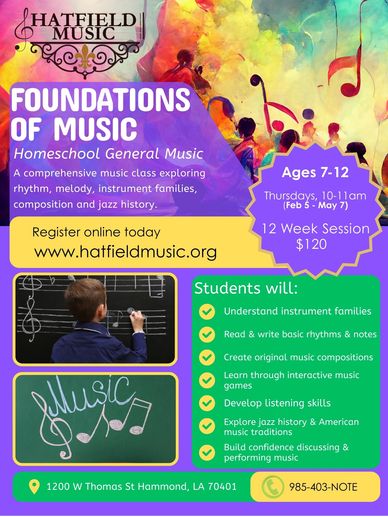 Foundations of Music is a comprehensive general music class designed for homeschool students ages 7–12. This course introduces students to the building blocks of music through hands-on learning, listening activities, composition, and historical study.