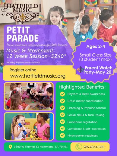 Petit Parade is a joyful, structured music and movement class designed especially for young children. Through singing, movement, instruments, and imaginative play, students build musical foundations while developing coordination, listening skills, and confidence.